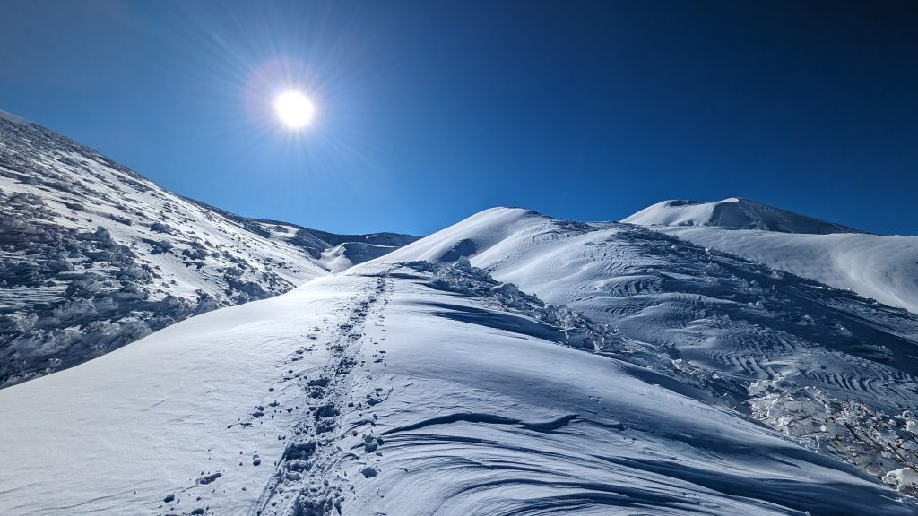 12月から3月にかけて、秋田駒ヶ岳はバックカントリースキーやスノーボードを楽しむ人々のための雪の遊び場と化す(訳注:バックカントリーとは、整備されたスキー場でなく、自然の森や林の中を滑ること)。彼らは、山頂付近の素晴らしいパウダースノーを求めて、アルパこまくさから雪山を登っていくのだ。スキーやスノーボードをしない人でも、スノーシュー(雪上歩行具)を使ってハイキングを楽しむことができるが、冬の登山は時間がかかるため、丸一日かかる覚悟が必要だ。晴れ渡った青空の日には、スキーやスノーシューの足跡が駐車場から山頂に続いているが、GPSアプリ(ヤマップなど)を使ったり、筆者のようなガイドを雇ったりすることをおすすめする。