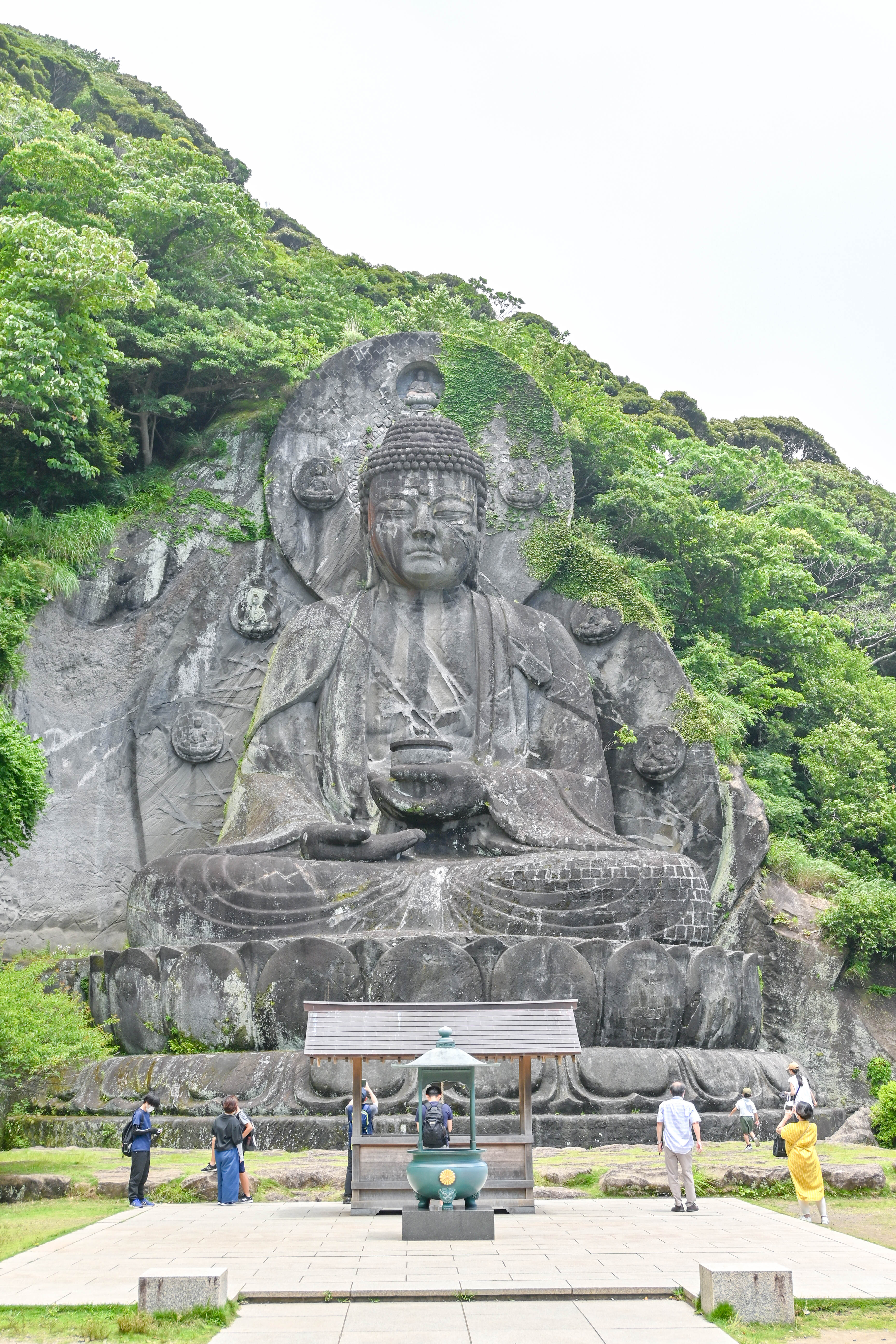 すでに写真などで目にしたことがあるかもしれないが、鋸山には、日本寺の住職の発願によって岩肌に刻まれた巨大な日本寺大仏や観音像がある。寺の境内は、標高約330メートルある山の麓から山頂近くまで広がり、曲がりくねった石段沿いには数百体の仏像が点在している。歩いて登ると、まるで考古学の冒険をしているような気分になる一方で、かなりの運動にもなる。体力に不安があればロープウェーも利用できるが、歩けるなら登山ルートをおすすめしたい。山頂付近には地獄のぞきと呼ばれる絶景スポットもあり、この地の文化的な背景にも思いを馳せることができる。というのも、日本が19世紀後半に近代化を進めていた頃、この山は石材の採掘場として利用されていた。当時、険しい山道から石を運び下ろしていたのは、ほとんどが車力と呼ばれる女性たちだった。その歴史は、今も山沿いの案内板で知ることができる。
